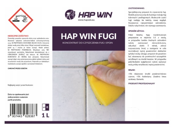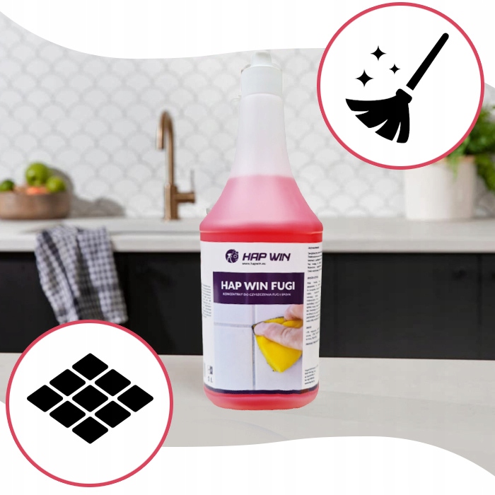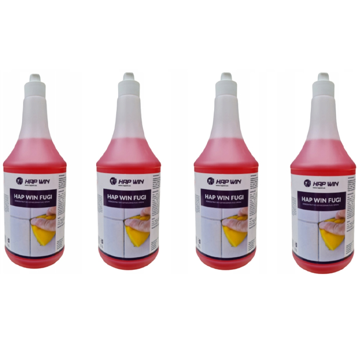 HAP WIN FUGI PŁYN DO CZYSZCZENIA FUG SPOIN ZESTAW 4szt. WYSOKA JAKOŚĆ Skuteczny koncentrat o bardzo silnym działaniu do czyszczenia fug i spoin cementowych ściennych oraz podłogowych w kuchni, łazience, na tarasie itp. Czyści i odnawia kolor. Preparat działa natychmiastowo, rozpuszczając stary brud. Ogromnymi zaletami płynu są łatwa aplikacja i szybki efekt – wystarczy 30 sekund, by pozbyć się bakterii i zarazków. Nie wymaga on szorowania, przez co czyszczenie podłogi jest szybkie i skuteczne. Z E S T A W Z A W I E R A: HAP WIN FUGI 1L - Środek do fug Ilość: 4 szt. Producent: Hap Win Pojemność: 4 x 1L