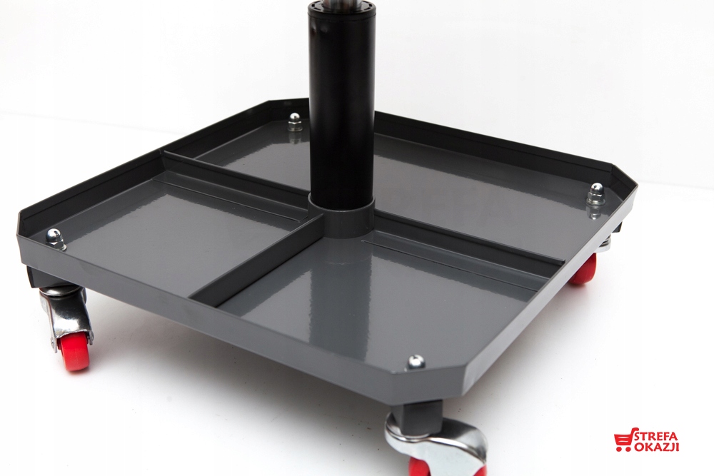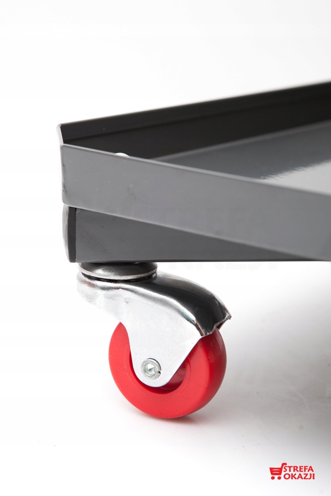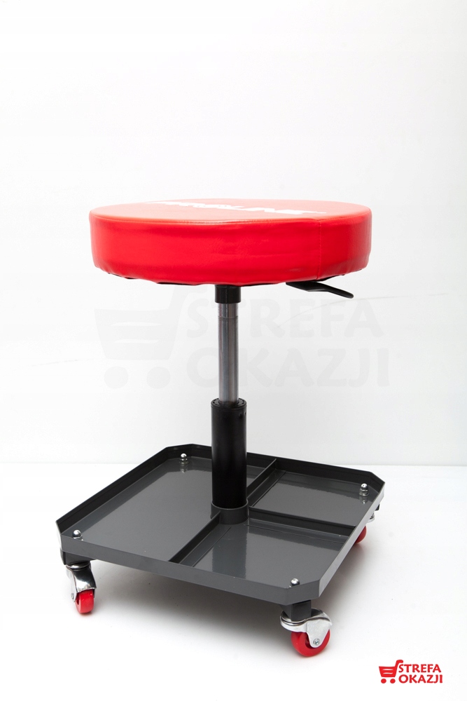 Siedziska są tapicerowane, wyposażone w cztery w pełni obrotowe kółka by wygodnie mieć dostęp do wyposażenie warsztatu.