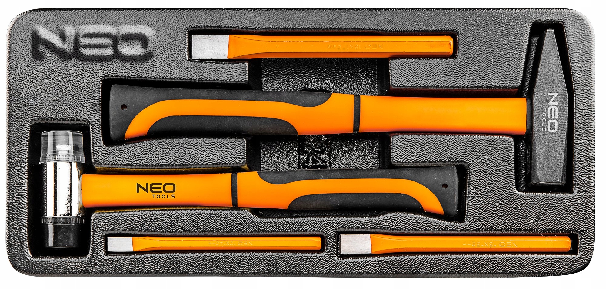 Młotki i wybijaki, zestaw 5 szt. NEO (nr ref. 84-242) zawiera 3 wybijaki i 2 młotki. Wybijaki wykonane z wysokiej jakości stali chromowo-vanadowej, przedłużającej żywotność narzędzia. Młotek ślusarski oraz blacharski z uchwytami z włókna szklanego zapewnią trwałość i solidność w codziennej pracy. Dostarczane w wytłoczce z tworzywa, pasującej do szuflad szafek warsztatowych NEO 84-221 i 84-222. Marka NEO spełnia oczekiwania profesjonalistów.